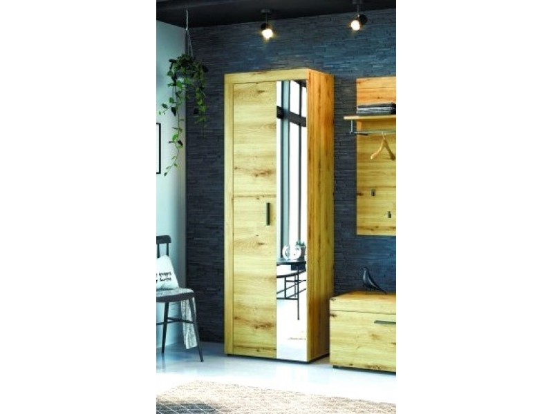 Гардеробът Фокус на мебелна компания СОК е изработен в приятния дървесен цвят „дъб артисан“, който внася топлина и натурална нотка в интериора. Единичната врата е допълнена от огледален елемент, който не само улеснява ежедневната подготовка, но и визуално разширява и озарява пространството – особено полезно в тесни коридори и малки антрета.