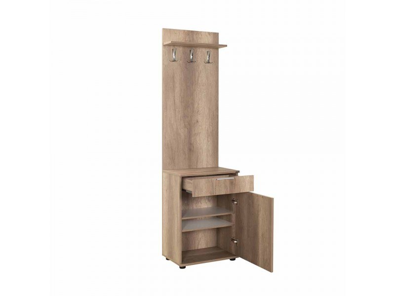 Дизайнът на това мебелно изделие е авангарден и модерен. То е съставено от шкаф с чекмедже и гръб, върху който са поставени три метални закачалки. Със съвсем малкия си размер: 52/ 187/ 36см за широчина/височина/дълбочина, модулът е особено подходящ за съвсем тесни предверия и дори за коридори.