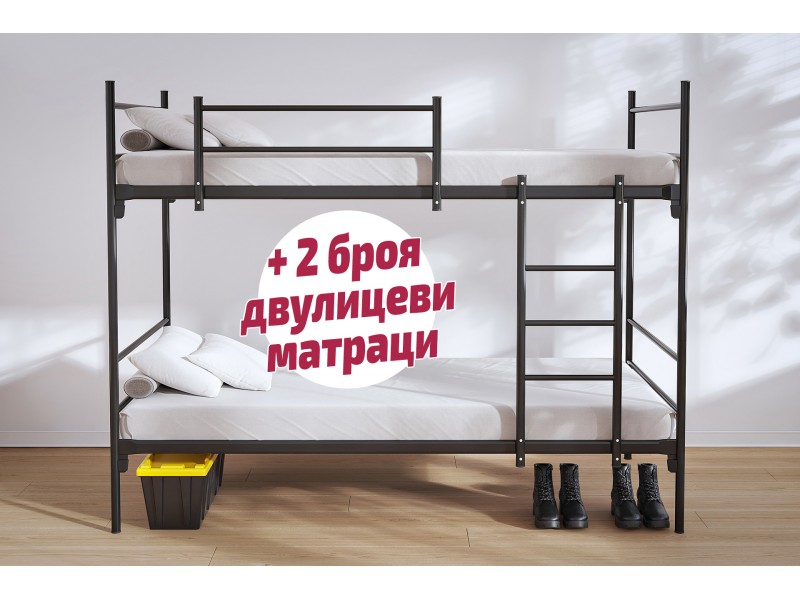 • Двуетажни легла, които стават и на две отделни легла. + ПОДАРЪК 2 броя двулицеви матраци! Материал: Метал.