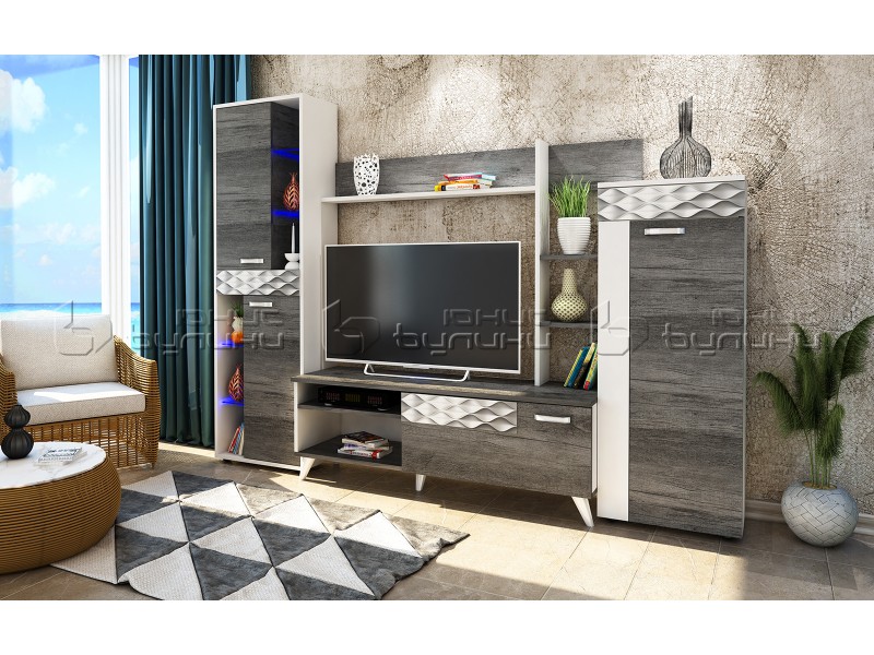 Секцията се състои от ТВ – шкаф, два високи шкафа от двете му страни и укрепени между тях лавици. Това е една същевременно привлекателна и много практична конфигурация. Всеки модул има важна роля както във функционално, така и в естетическо отношение. С леко наклонените си настрани крака, тв-шкафът има приятна ретро визия, която си кореспондира отлично с дизайна на останалите мебели.