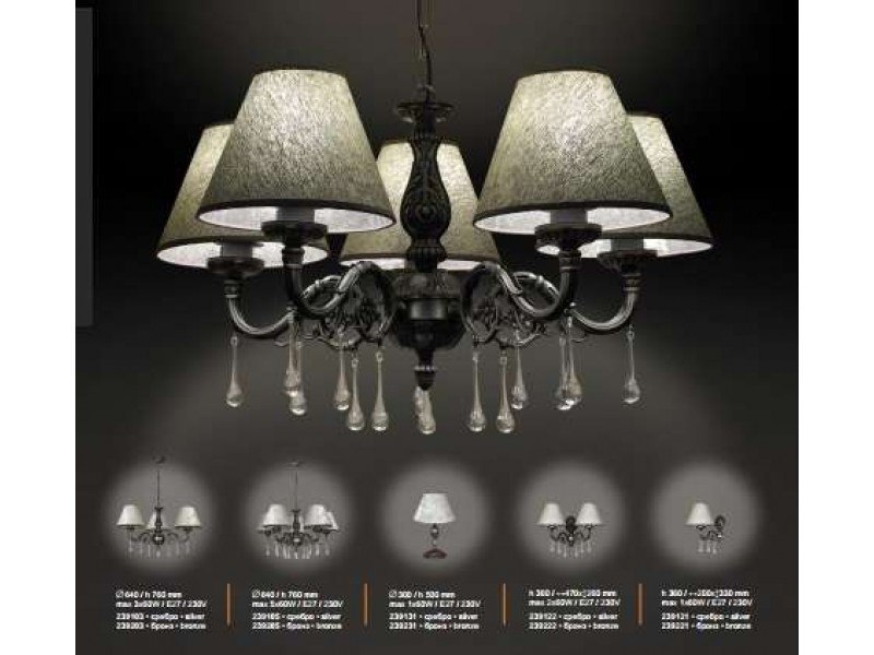 Размер: Ф 640, h 760мм.; Мощност: max 5*60W.; Вид фасунга: Е 27.; Тегло: 3 кг.; Цвят: Антично сребро 239105, Античен месинг 239205.; Срок на изработка – налично.;